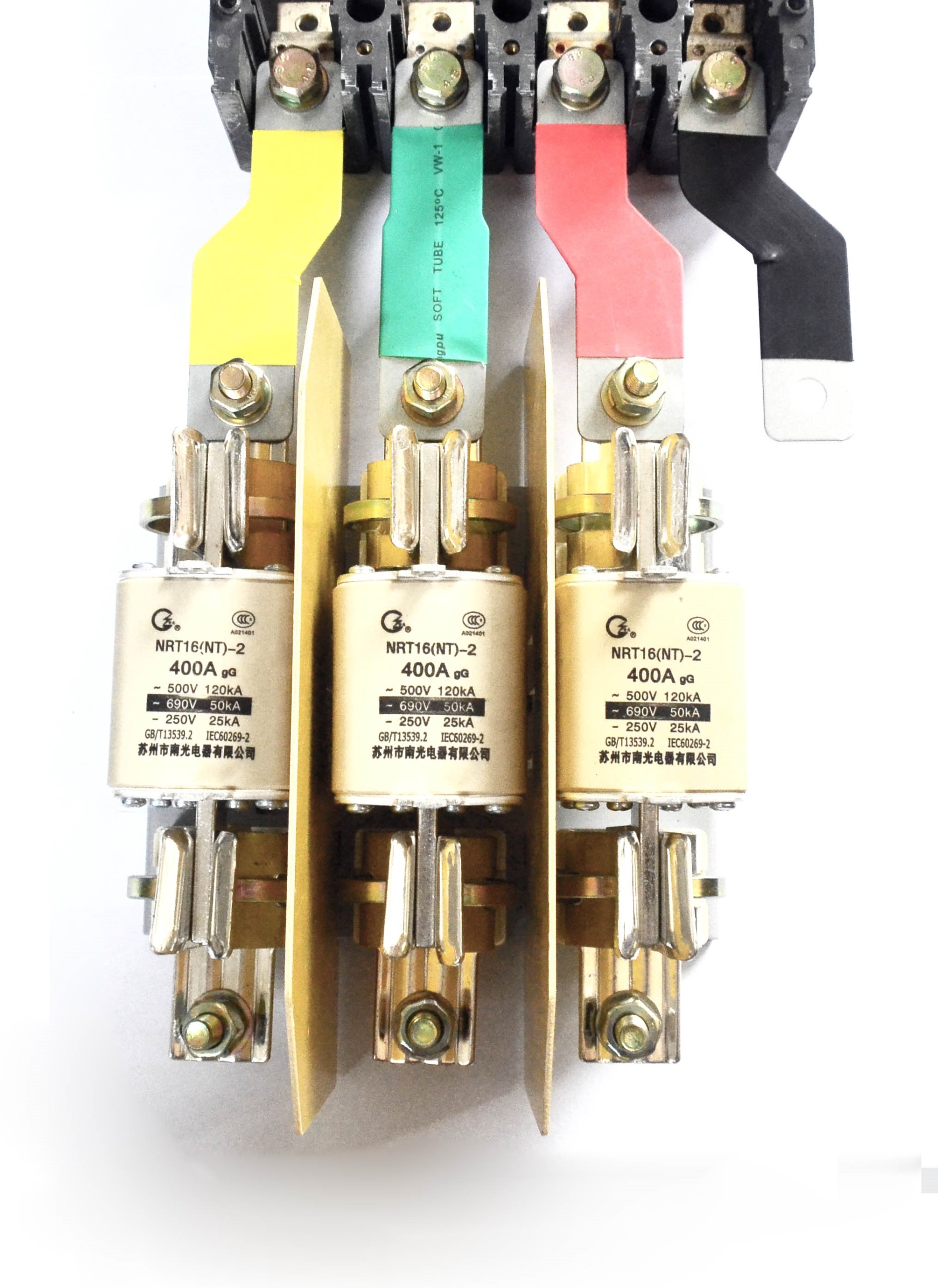 NRT16-□/3P熔斷器及與斷路器連接排的優(yōu)點(diǎn):1.安裝方便a)熔斷器的本體安裝只需兩套安裝螺釘;(原一組單體需兩套安裝螺釘,三組單體總共需六套安裝螺釘,現(xiàn)節(jié)省了螺釘及安裝時(shí)間)b)與斷路器連接時(shí),用專用連接排聯(lián)結(jié),省去了連接排制作過程,所有連接排制作達(dá)到一致性與平整性的效果。c)用專用連接排聯(lián)結(jié),能有效地節(jié)省熔斷器與斷路器的間隔距離,增加了外接電纜操作時(shí)安裝空間(向上增加10cm)。2.節(jié)省材